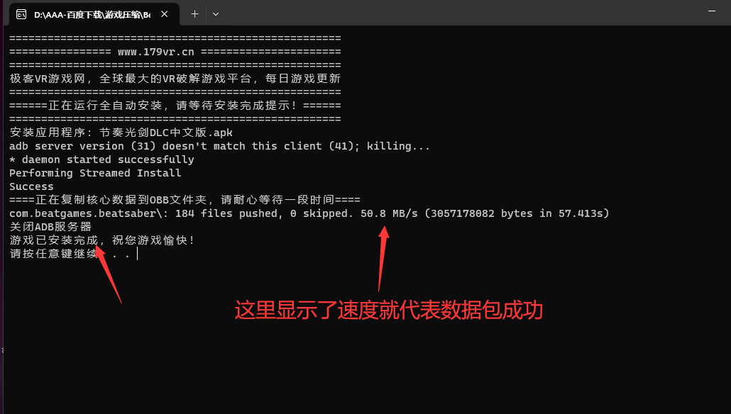 不管你是Quest 2 还是 Quest 3 解压后使用双击自动安装,一定要等提示安装和复制都完成后在打开游戏!