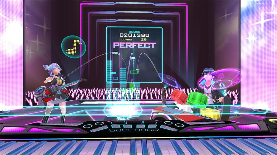 《Beat Arena》的玩法与你预期的差不多——音符随着音乐节奏及时向你“流动”过来,你必须用相应的乐器在正确的位置击打它们。
