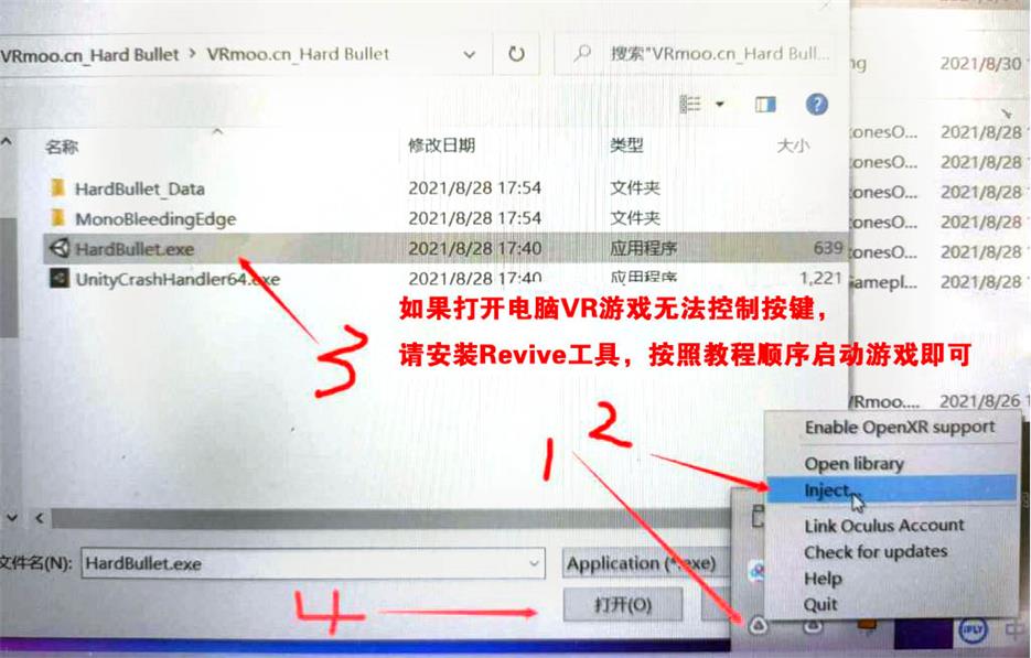 - 下载REVIVE,下载后双击打开,桌面右下角出现一个三角图标,然后打开SteamVR并就绪后,右击三角图标,选择Inject,选择你要打开的游戏程序即可